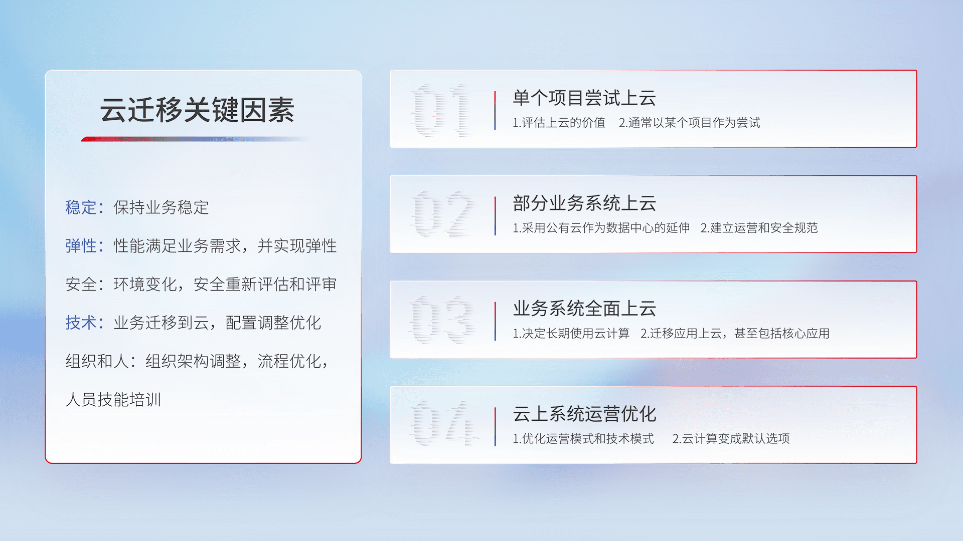 结合实际业务,,,从规划设计、、、、云平台选型、、、、云原生改造、、、、数据迁移、、集成交付,,,,迁移全过程为客户识别最佳上云路径,,,,做好风险识别管理,,,,设计网络架构、、、、身份权限、、安全审计合规、、、、操作审计、、、、日志审计、、监控告警策略、、、多站点容灾设计等,,,,对云上基础设施进行整体规划,,,,提升IT治理水平,,,,以满足弹性、、、高可用、、高性能的需求。。。。